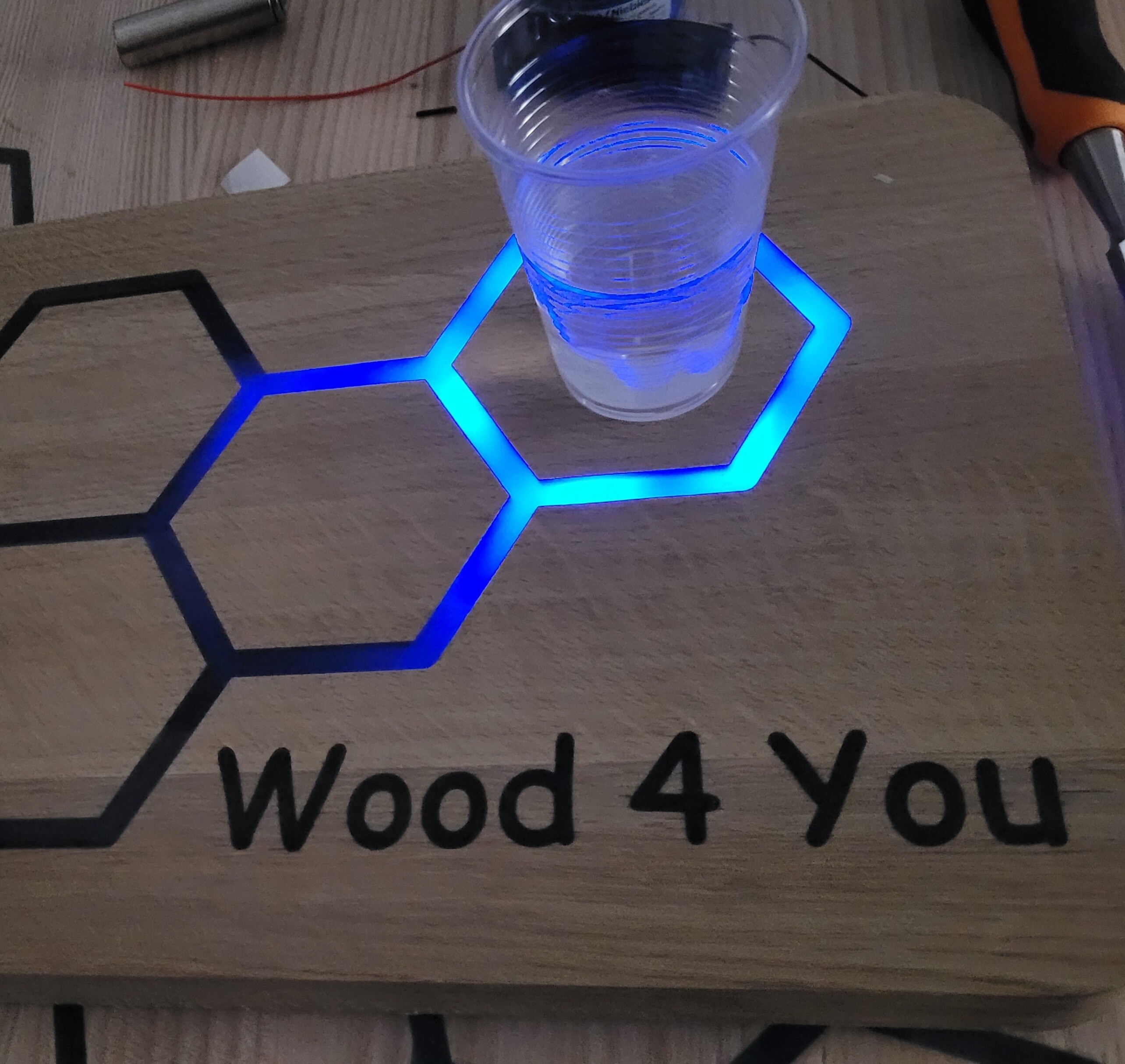 Rozwinięcie projektu Interaktywnego stołu LED - klient również potrzebował desek do serwowania w których obszar podświetla się po położeniu na nim napoju - ciekawy pomysł na "klawiaturę" w innym wydaniu.
