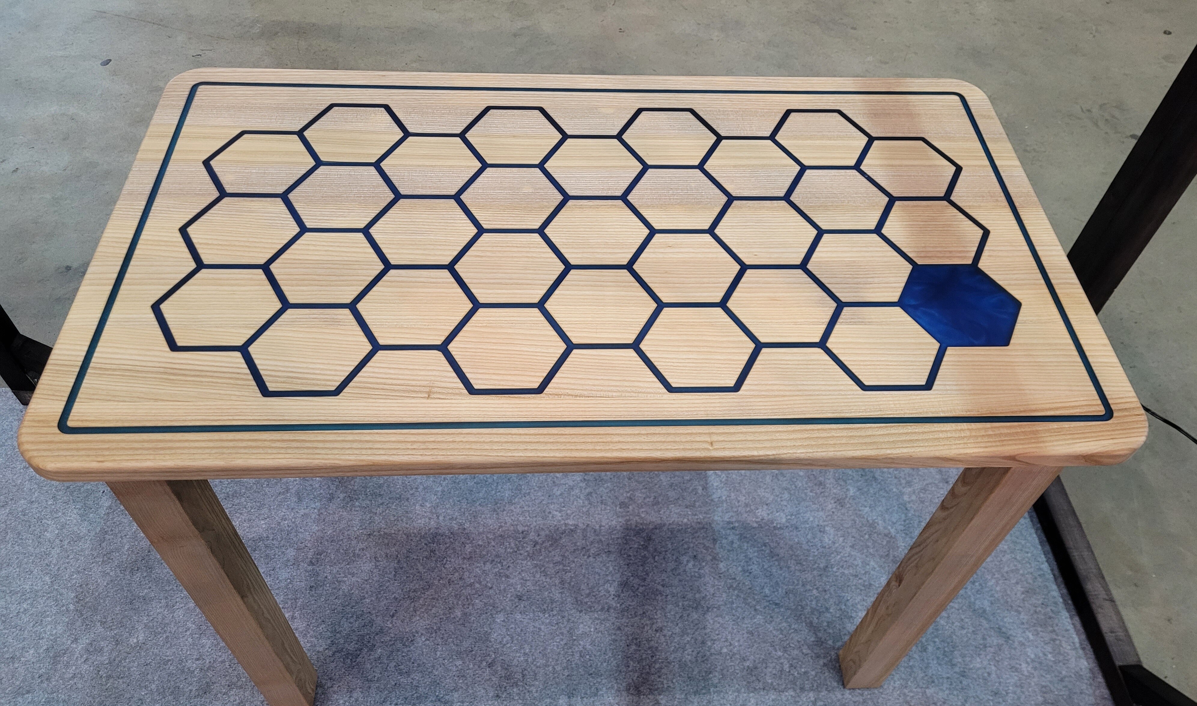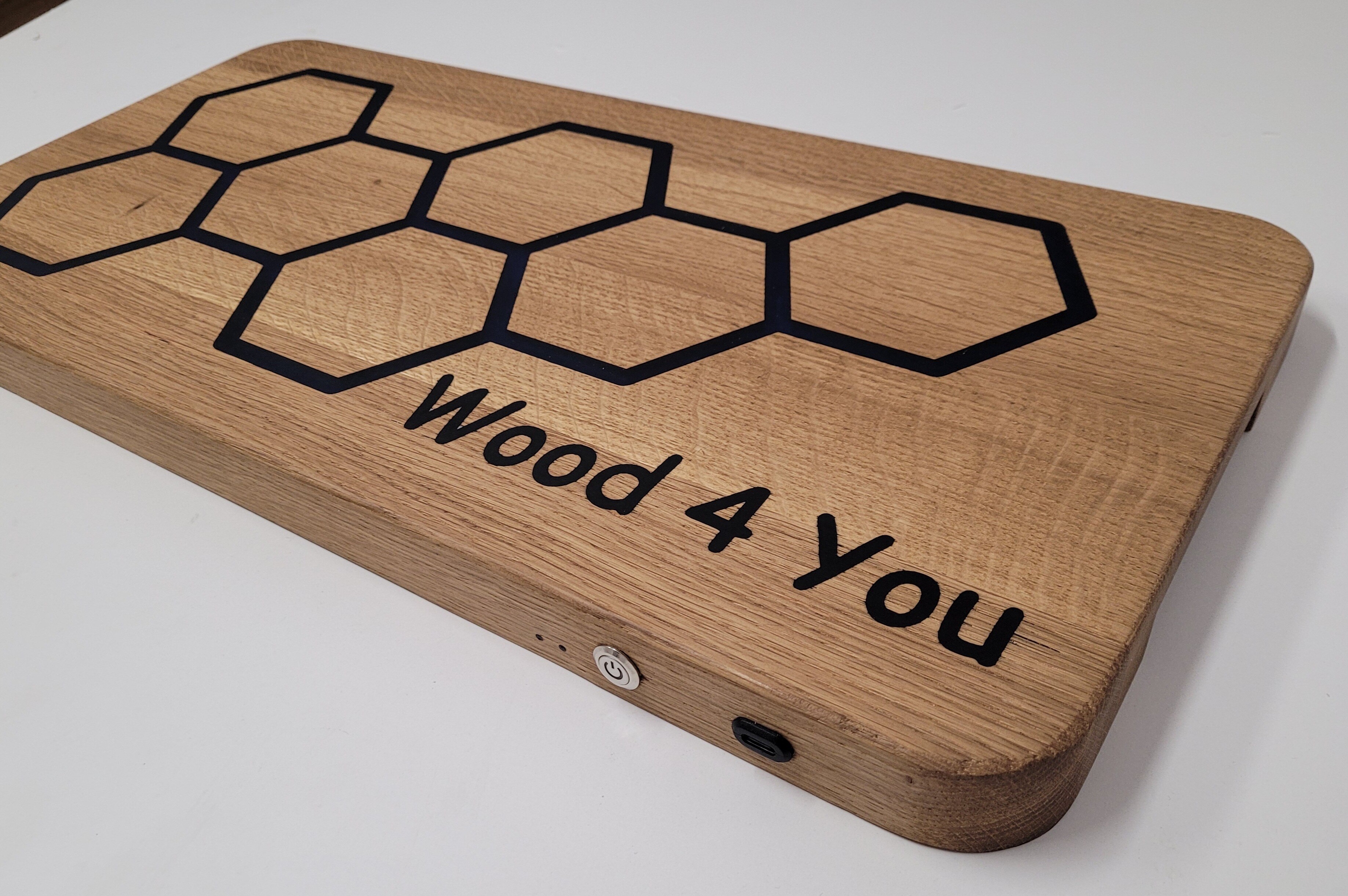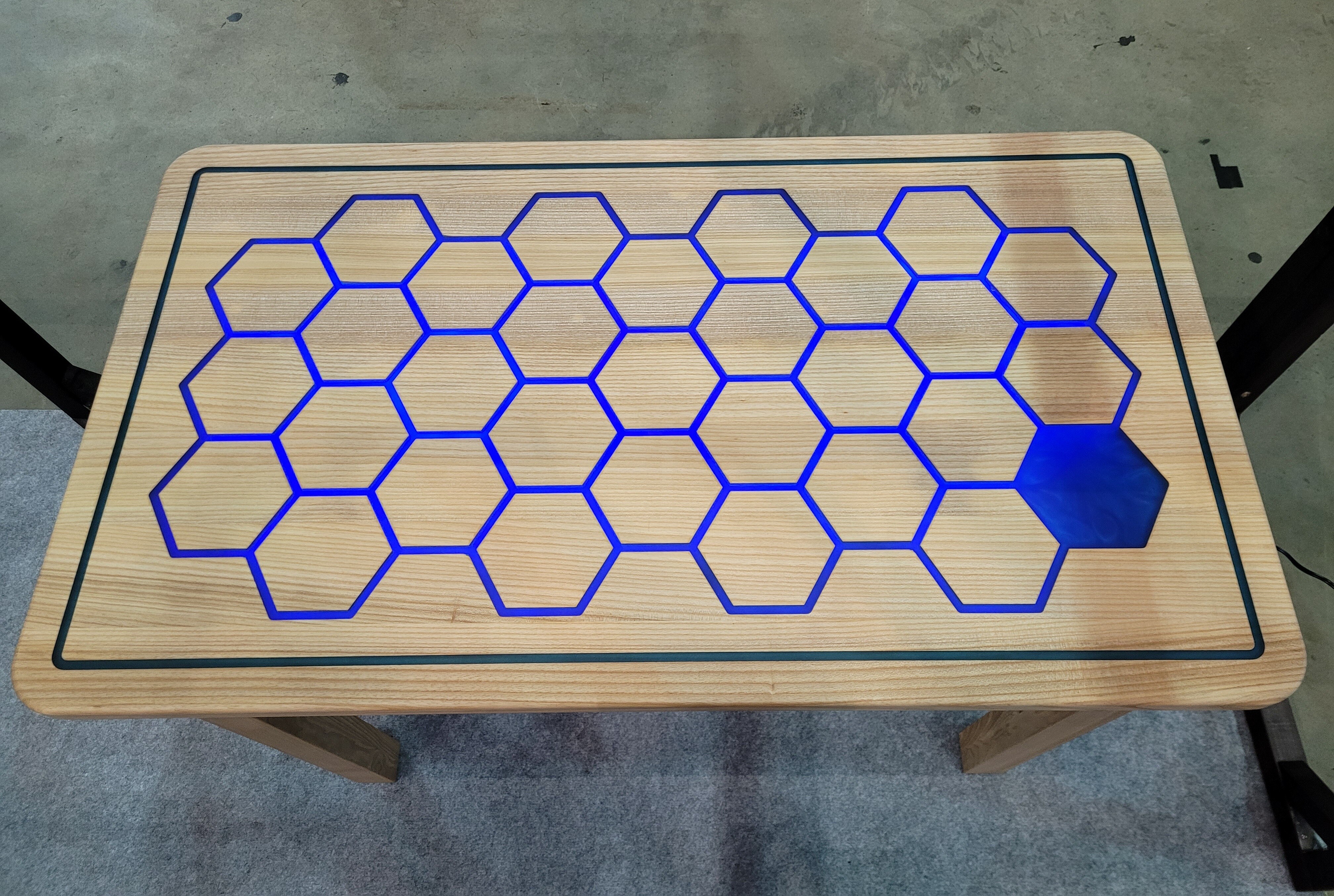 Interaktywny stół wykonany z drewna dębu i żywicy epoksydowej wykonany we współpracy z naszą zaprzyjaźnioną stolarnią.